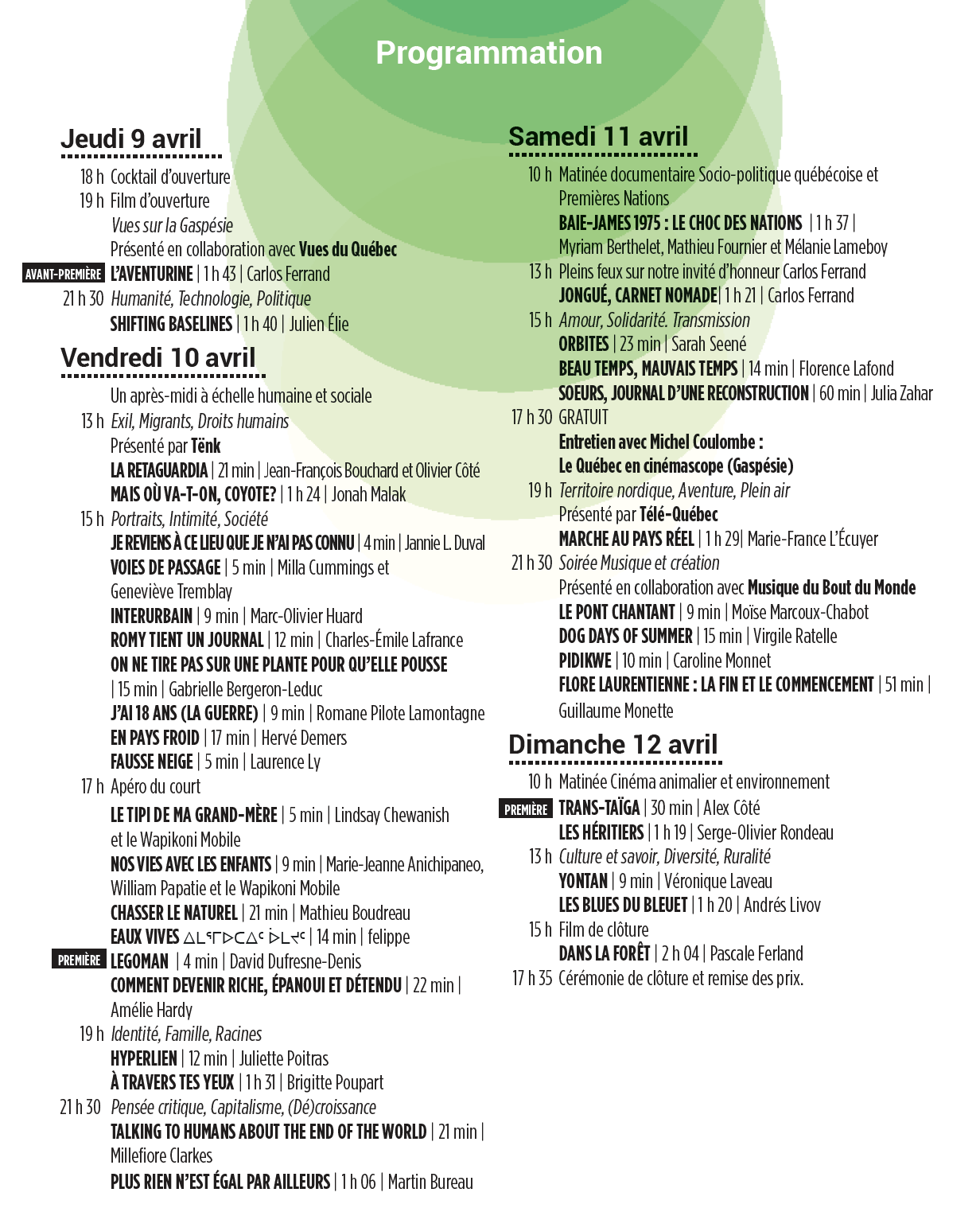 | 18 h COCKTAIL D'OUVERTURE 18 H 45 MOT D'OUVERTURE ET ALLOCUTIONS | 13 h APRÈS-MIDI DOCU-SOCIAL Les eaux calmes Ilnikueu - Poupées de guérison Ce que je suis ici Ibuka, Justice Santé mentale La légende de Laurent et La Lièvre | 10 h TOURNÉE CINÉMA SOUS LES ÉTOILES (MATINÉE GRATUITE) Outside Center Juste un toit Claude Parc Ex au coeur de MTL suivi d'un entretien avec Clément Guillaume et Ayesha Sheikh | 10 h DOCU-ENVIRONNEMENT (MATINÉE GRATUITE) Perdre le bleu Amazonie, à la rencontre des gardiens et gardiennes de la forêt |
